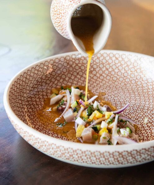 Lunch might be sopes (handmade thick tortillas filled with beans and topped with lettuce, tomato, onion, etc.), ceviche, pozole, freshly caught seafood, or roasted vegetables. To complement, we have a salad bar that celebrates more produce from the farm for you to create your own colourful side, and of course, fresh tortillas plus aguas frescas to drink.